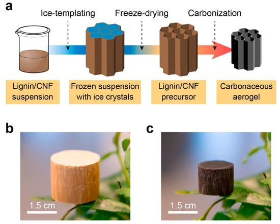 (a) Schematic preparation of carbon aerogels, (b) lignin/CNF precursor, and (c) carbon aerogel. Reproduced with permission. Copyright 2021, Elsevier Inc. [].
