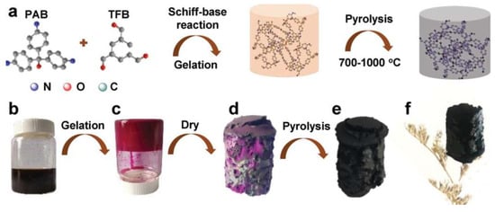 (a) Illustrations of NCA synthesis, (b) polymer reaction solution, (c) polymer gelation, (d) polymer aerogel, (e) NCA after pyrolysis, and (f) NCA with standing-up pistils. Reproduced with permission. Copyright 2019, WILEY-VCH Verlag GmbH & Co. KGaA, Weinheim [].