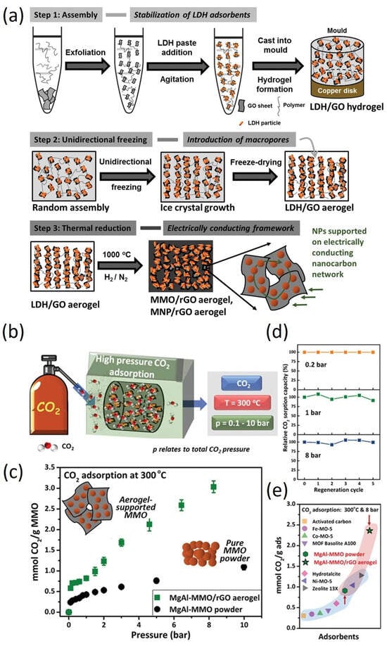 (a) Schematic illustration of synthesis process for electrically conductive sorbent–nanoparticle/rGO hybrid aerogel, with MMO representing mixed metal oxide and MNP denoting metal nanoparticles; (b) depiction of CO2 adsorption under high-pressure conditions on MgAl–MMO/rGO aerogels; (c) CO2 adsorption isotherms for MgAl–MMO powder and MgAl–MMO/rGO aerogel measured at 300 °C across a pressure range of 0.2–10 bar; (d) CO2 capacity retention performance of MgAl–MMO/rGO aerogel over five regeneration cycles at 400 °C under CO2 pressures of 0.2, 1, and 8 bar; and (e) comparison of high-pressure CO2 sorption capacities (8 bar, 300 °C) of MgAl–MMO powder and MgAl–MMO/rGO aerogel with those of other sorbent materials. Reproduced with permission. Copyright 2020, WILEY–VCH Verlag GmbH [].