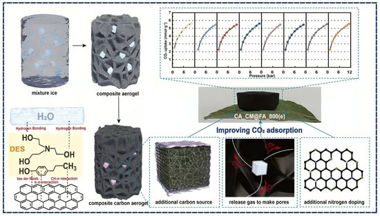 Schematic illustration of strategy for enhancing CO2 adsorption in hierarchical porous carbon aerogels through pyrolysis of deep eutectic solvent-encapsulated carbon precursor. Reproduced with permission. Copyright 2025, Elsevier Ltd. [].