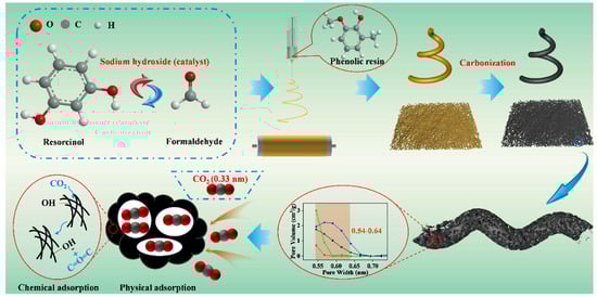 Electrospinning is an alternative strategy for fabricating carbon aerogels with controlled three-dimensional architectures. This technique involves applying a high-voltage electric field to a viscoelastic polymer solution, which forms ultrafine nanofibers. The Yi group applied this method to resorcinol–formaldehyde solutions to create carbon aerogel fibers (CAFs), followed by high-temperature carbonization. These fibers offered high surface areas (1188.63 m2 g−1), high aspect ratios, and approximately 15% oxygen-containing functional groups (Figure 9) []. Carbonization temperature significantly influenced pore development, particularly in the 0.54–0.64 nm range. Increasing the temperature from 600 °C to 800 °C resulted in a rise in pore volume from 0.01 cm3 g−1 to 0.20 cm3 g−1, but further heating to 900 °C reduced the pore volume to 0.11 cm3 g−1, likely due to pore collapse. These CAFs achieved a CO2 adsorption capacity of 4.25 mmol g−1 at 800 °C and one of 3.73 mmol g−1 at 900 °C (0 °C, 1 bar), highlighting the effectiveness of ultra-micropores (0.5–0.8 nm) for low-pressure CO2 capture. While functional groups may contribute to adsorption, the consistent oxygen content across samples suggests ultra-micropores play a dominant role [].