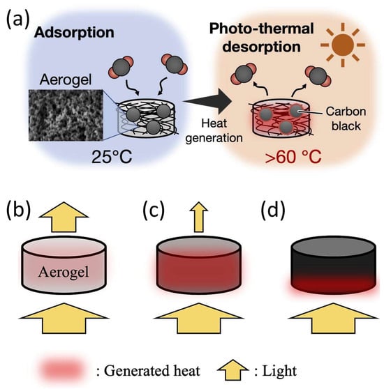 (a) Schematics of DAC by aerogel and photo-thermal desorption, and carbon black concentration to generated heat (b) small amount, (c) optimal amount, and (d) excess amount. Reproduced with permission. Copyright 2024, Elsevier B.V. [].
