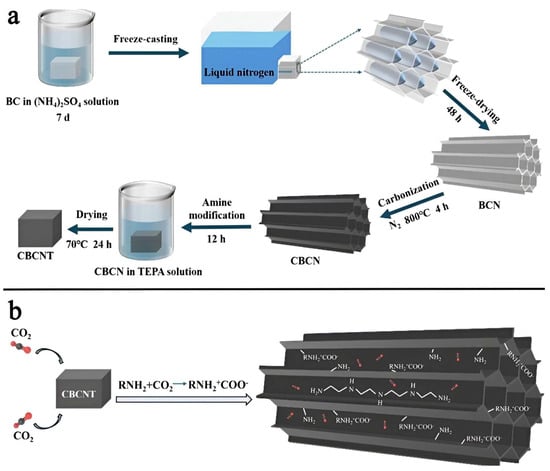 (a) Schematics of CBCNT preparation, and (b) schematics of the CO2 adsorption on modified CBCNT. Reproduced with permission. Copyright 2024, Elsevier Ltd. [].