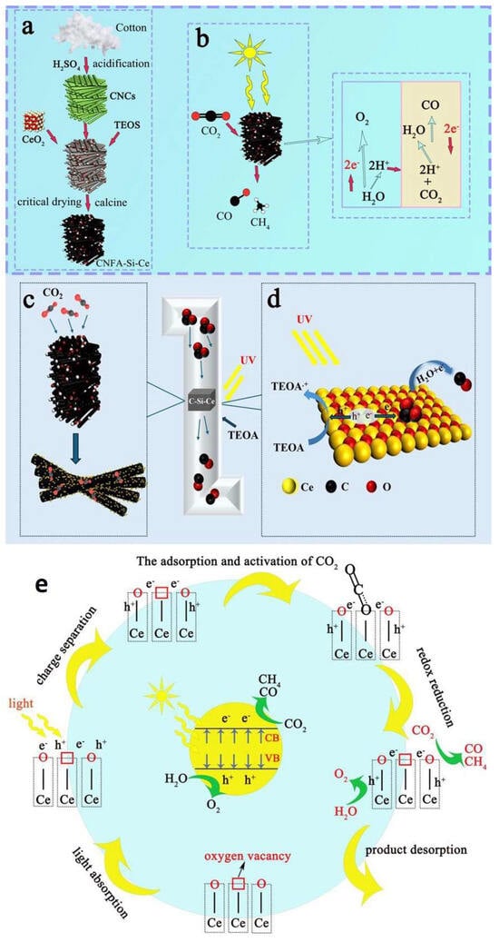 To advance beyond capture alone, integration with catalytic CO2 conversion was explored. Conventional reduction processes often suffer from energy-intensive requirements due to CO2’s thermodynamic stability. Photocatalysis presents a sustainable alternative by utilizing solar energy to activate and convert CO2 under mild conditions [,,,,]. Rong et al. developed a silica–cerium-doped cellulose-derived carbon aerogel (CNFA–Si–Ce) by combining cellulose nanocrystals with tetraethyl orthosilicate (TEOS) and cerium nitrate, followed by supercritical drying and calcination (Figure 12) []. The resulting material featured a hierarchically porous structure that enhanced both CO2 diffusion and adsorption. Cerium, known for its photocatalytic properties, was strategically incorporated to engineer electronic vacancies in the aerogel matrix. These vacancies—particularly oxygen vacancies—serve as active sites that lower the activation barrier for CO2 adsorption and facilitate its reduction. The CNFA–Si–Ce aerogel exhibited a CO2 uptake of 3.18 mmol g−1 at 25 °C and 1 bar. Under simulated solar light, the catalyst achieved a CO production rate of 59.5 µmol h−1 and an electron consumption rate of 119 µmol h−1 g−1, underscoring its efficient conversion performance [,,,]. This integrated system exemplifies the potential of multifunctional aerogels that unify capture and conversion processes. By combining tailored pore architecture, surface functionalization, and catalytic elements, such aerogels offer a low-energy, scalable platform for CO2 mitigation and valorization.