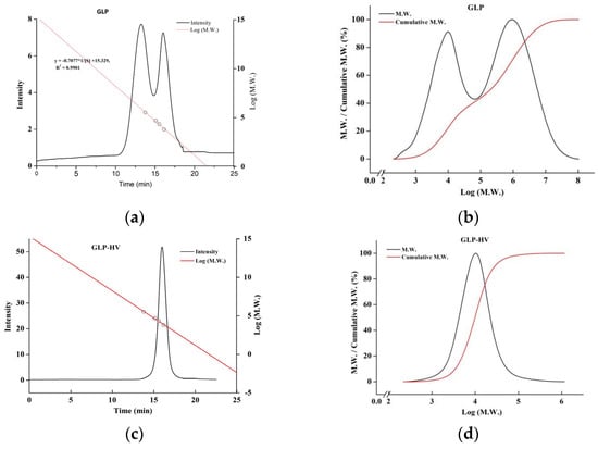 Molecular weight chromatogram and distribution of G. lemaneiformis polysaccharide gels. (a) Molecular weight chromatogram of GLP; (b) molecular weight distribution of GLP; (c) molecular weight chromatogram of GLP-HV; (d) molecular weight distribution of GLP-HV.