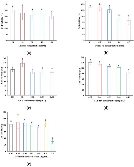 Cell viability of glucose, oleic acid, GLP, GLP-HV, and metformin in HepG2 cells. Note: (a) cell viability of glucose in HepG2 cells; (b) cell viability of oleic acid in HepG2 cells; (c) cell viability of GLP in HepG2 cells; (d) cell viability of GLP-HV in HepG2 cells; (e) cell viability of metformin in HepG2 cells. a, b and c represent significant differences, and p < 0.05 indicates significant differences.