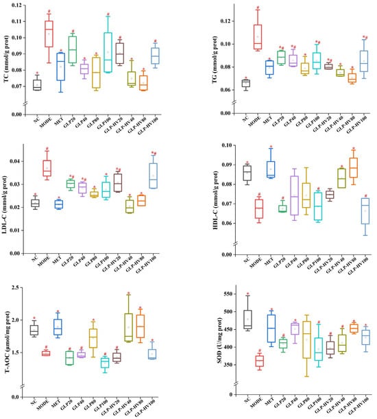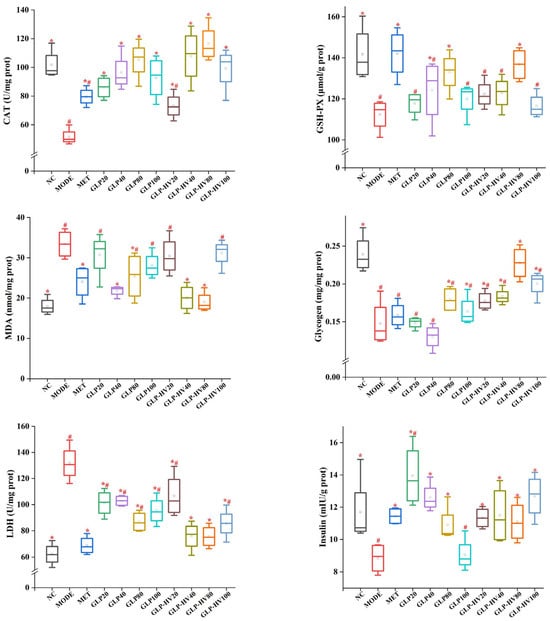 The activities of TC, TG, HDL-C, LDL-C, T-AOC, SOD, MDA, CAT, GSH-PX, LDH, glycogen, and insulin are displayed in Figure 3. The contents of TC, TG, and LDL-C were higher in MODE (0.1023 ± 0.0128 mmol/g prot, 0.1062 ± 0.0162 mmol/g prot, and 0.0370 ± 0.0053 mmol/g prot, respectively) than NC (0.0708 ± 0.0043 mmol/g prot, 0.0656 ± 0.0043 mmol/g prot, and 0.0218 ± 0.0024 mmol/g prot, respectively) (p < 0.05). Conversely, MODE markedly decreased HDL-C levels from 0.0857 ± 0.0047 mmol/g prot to 0.0674 ± 0.0059 mmol/g prot compared to NC. The results indicated that glucose and oleic acid caused abnormal glycometabolism. G. lemaneiformis polysaccharide gels supplement observably reduced the content of TC, TG, and LDL-C and enhanced HDL-C content, especially GLP-HV, which was in line with the literature [].