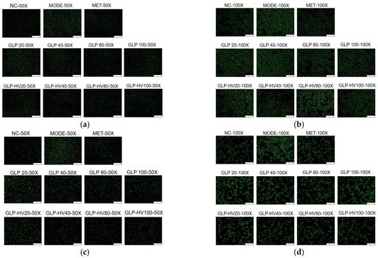 Calcium ions intensity reflects cell metabolism and oxidative damage, and high concentrations of calcium ions can also cause metabolic disorders and accelerate cell apoptosis []. Fluo-3 AM fluorescence probe is a common method to detect calcium ion concentration in cells, and it shows green fluorescence under an inverted fluorescence microscope []. As exhibited in Figure 4c,d, glucose and oleic acid induced cells to produce stronger calcium ion intensity, resulting in damage to certain cells, while GLP and GLP-HV, especially GLP-HV, had a certain repair ability on the injured cells, weakening the intracellular calcium ions concentration. GLP-HV with 40 μg/mL presented the best effect, that was similar to the ROS clear effect. In our previous studies, GLP-HV expressed better physiological activity of relieving oxidative stress in HepG2 cells induced by H2O2 []. The results proved that G. lemaneiformis polysaccharide gels provided an excellent effect on hypoglycemic activity.