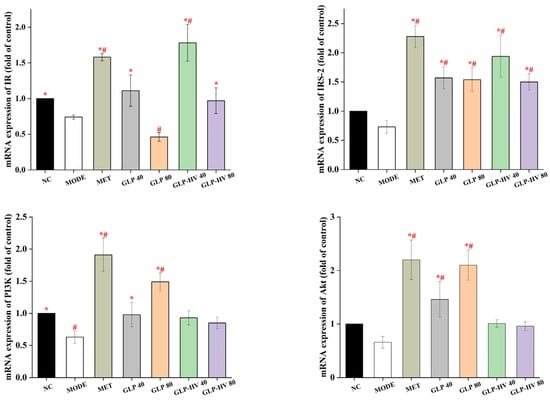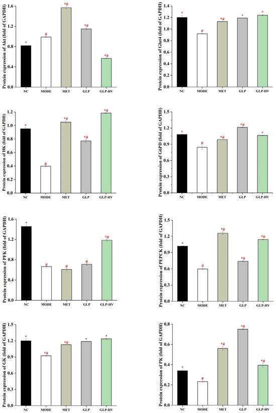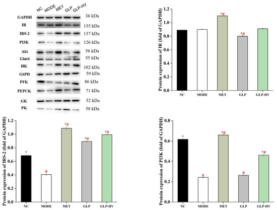 To further disclose the hypoglycemic mechanism of G. lemaneiformis polysaccharide gels, the proteins expression of IR/IRS-2/PI3k/Akt/Glut4 and glycometabolism signaling pathways are exhibited in Figure 6. The proteins expression of IRS-2, PI3k, and Glut4 were reduced in MODE, and GLP-HV treatment remarkably promoted these proteins’ levels (p < 0.05). However, there was no significant difference in IR protein expression between NC, MODE, and GLP-HV (p > 0.05). GLP improved the Akt protein level, while GLP-HV down-regulated it. IRS-2 is involved in the phosphorylated protein of insulin and other cytokine signaling. The apparent enhancement of IR-2 can bind to PI3K, stimulating its activity and accelerating phospholipid metabolism. Apparently, GLP-HV advanced the PI3K protein, promoting the expression of Glut4. Phosphorylation and protein expression of relevant factors in the IR/IRS-2/PI3k/Akt/Glut4 signaling pathway maintain glucose and insulin metabolism and homeostasis.
