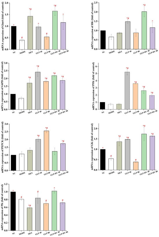 HK, G6PD, PFK, PEPCK, GK, and PK belong to the key enzymes involved in glycometabolism and play an important role in glucose stability and metabolism []. As shown in Figure 5, mRNA expression of HK, G6PD, PFK, and PEPCK had no significant difference between NC and MODE, whereas GLP and GLP-HV enhanced expression of these genes. HK is a key enzyme in the conversion of glucose into glucose-6-phosphatase, which effectively reduces glucose content []. The mRNA level of HK of GLP-HV with 40 μg/mL was more than 2 times that of the MODE group (p < 0.05). PEPCK is a key mediator of gluconeogenesis, playing a key role in the uptake pathway that converts oxaloacetic acid to pyruvate phosphate and activates antioxidant production, which in turn modulates glucose homeostasis metabolism []. In this experiment, GLP-HV (40 μg/mL) had no prominent discrepancy compared to the MODE group, and GLP-HV (80 μg/mL) showed an obvious effect. Moreover, mRNA expression of GK and PK in MODE group were markedly down-regulated compared to NC, and GLP-HV (40 μg/mL) observably up-regulated these two genes (p < 0.05). Based on the above results, GLP-HV expressed a remarkable effect on glycometabolism. G. lemaneiformis polysaccharide gels regulated gluconeogenesis and glycolysis enzymes, inhibited lipid decomposition in cells, promoted glucose utilization, reduced free fatty acid accumulation, thereby improving lipid aggregation in cells, and had a regulatory effect on cellular glycometabolism.