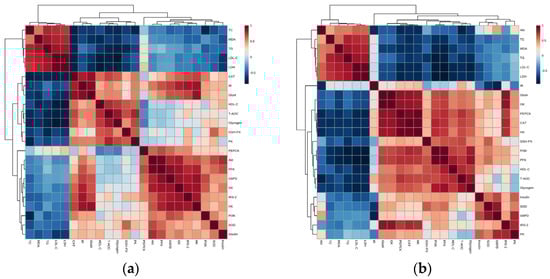 Spearman’s correlation between hypoglycemic activity and mechanism of G. lemaneiformis polysaccharide gels. Note: (a) the correlation between biochemical indexes and genes of signaling pathways; (b) the correlation between biochemical indexes and proteins of signaling pathways.