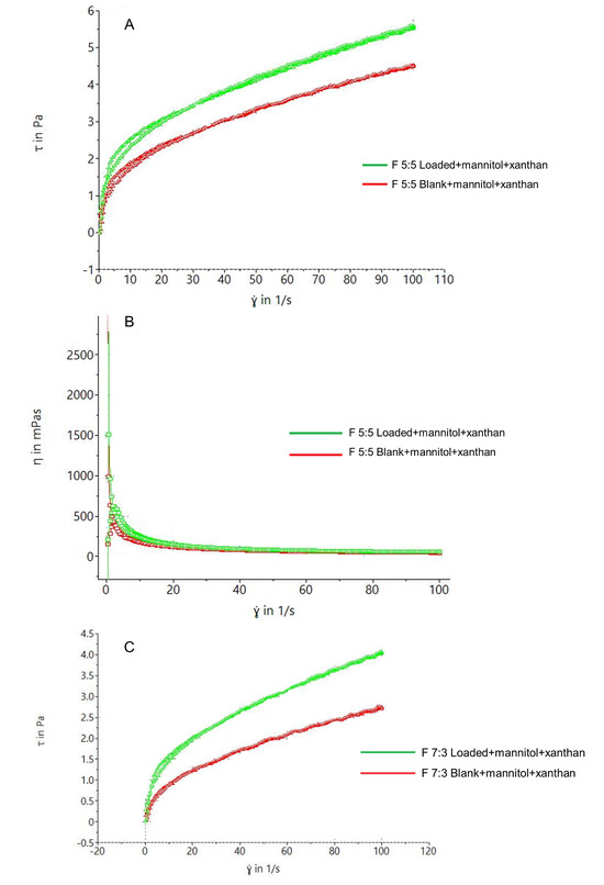 Sample F 5:5 in Figure 6A illustrates the visco-elasticity of the foams, with shear stress increasing with shear rate and returning to the initial shear stress, forming a hysteresis loop. This loop indicates thixotropic behavior, with foam bubbles remaining relatively intact after stress application. Figure 6C shows the coexistence of thixotropic and anti-thixotropic behavior, as seen in F 7:3, where bubble deformation leads to anti-thixotropic behavior in less visco-elastic foams [48]. Due to its foam action, higher Labrasol concentration in F 5:5 may result in more visco-elastic foams compared to F 7:3, which has a lower Labrasol concentration.
