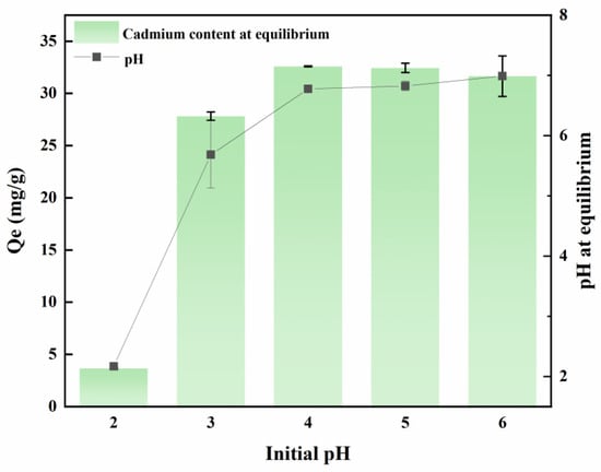 As depicted in Figure 1, the pH level exerts a substantial influence on the adsorption of MB-CA. Commencing from an initial pH range of 2 to 6, the adsorption capacity progressively escalates, ultimately achieving a steady state at 30 mg/g. In an environment with a pH of 2, the solution is abundant in H+ ions. These ions readily adsorb onto the surface of MB-CA, occupying a substantial proportion of the available adsorption sites. Simultaneously, Cd2+ exists in the form of cations and competes with H+ ions on the surface of the adsorption material, leading to a decrease in cadmium adsorption efficiency at a pH of 2. As the pH value gradually increases, the concentration of H+ ions decreases accordingly, reducing competitive interactions and allowing the composite material MB-CA to reach its maximum adsorption capacity. The maximum adsorption capacity at pH 2 is 3.65 mg/g, whereas at pH 4, it significantly increases to 32.59 mg/g, demonstrating a remarkable enhancement in adsorption capacity.