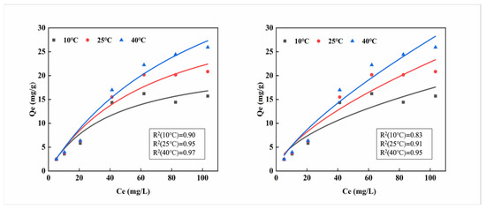 In this research, the Langmuir and Freundlich isothermal adsorption models were used to fit the experimental data, as shown in Equations (1) and (2), respectively: