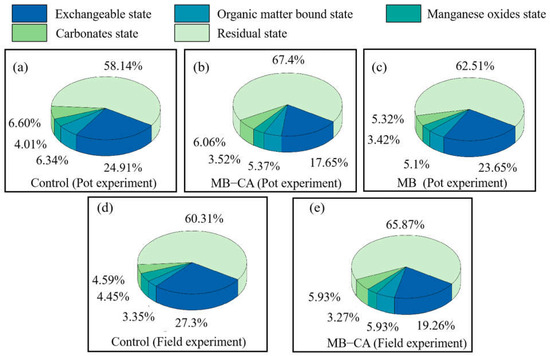 Effects of each treatment on soil Cd morphology in pot and field experiments.((a): Control (Pot experiment), (b): MB-CA (Pot experiment), (c): MB (Pot experiment), (d): Control (Field experiment), (e): MB-CA (Field experiment)).