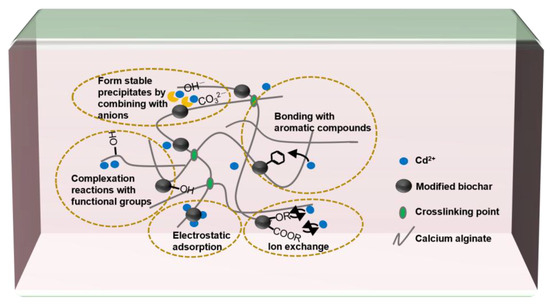 As shown in Figure 4, the mechanism in which the MB-CA reduces the Cd content in the soil mainly involves the combination of anions such as OH− and with Cd2+, or the complexation reactions between numerous functional groups in the MB-CA with Cd2+. According to research by Wang et al. [10], calcium alginate is rich in functional groups such as -COOH and -OH, which can rapidly coordinate with cadmium ions, thereby reducing the activity of heavy metal cadmium. In addition, the adsorption mechanism of Cd2+ also includes bonding with aromatic compounds, ion exchange with itself metal ions, and physical adsorption [23].