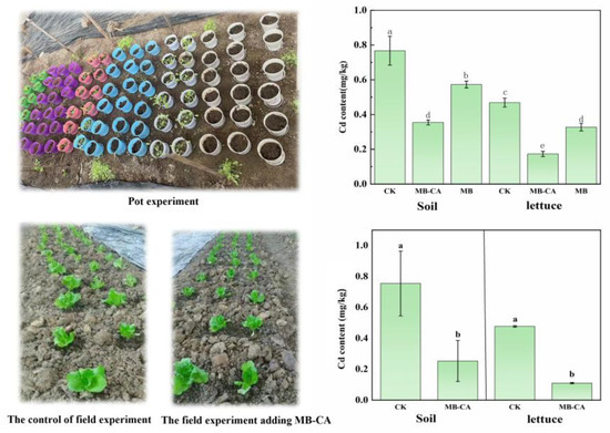The Cd content in lettuce plants showed significant differences under various treatments. As illustrated in Figure 5, the modified biochar (MB) treatment also demonstrated a certain passivation effect, but the composite material MB-CA had the most significant impact on reducing the Cd content in lettuce. Specifically, in field and pot experiments, MB-CA treatment reduced the cadmium content in lettuce by 63.11% and 76.92%, respectively, compared to the control group, while the MB treatment reduced it by 33.10%. The composite material MB-CA completed the adsorption and accumulation process of the heavy metal Cd in the soil, effectively reducing the Cd content in the soil and decreasing the bioavailability of soil Cd. The addition of the material significantly reduced the Cd content in the edible parts of the plants.
