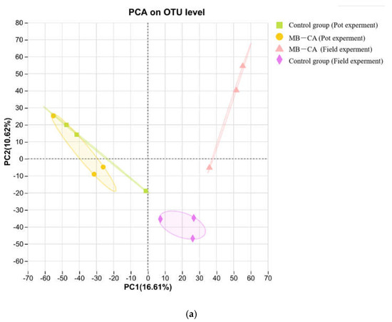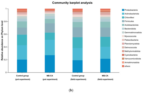As shown in Table 2, the microbial coverage rate was around 98%, indicating that the depth of gene sequencing could represent changes in the microbial community. According to the PCA results (Figure 6), the original field soil plotted in the fourth quadrant differed from the soil samples with added MB-CA. This is because calcium alginate has water retention and film-forming properties, which can improve soil aggregates and promote microbial activity. Meanwhile, biochar can stimulate microbial growth in the short term. The effect of this experiment was poorer in pot trials, with the original soils from pots and fields located in the first and second quadrants, respectively. The reason may be the lower microbial activity in the pots. The Chao1 index of the soil with added composite material MB-CA increased by 4% and decreased by 3%, respectively, indicating that this material does not negatively affect the relative abundance of microorganisms in the soil.
