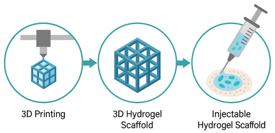 Three-dimensional structuring of injectable hydrogels allows for the creation of biomimetic scaffolds that replicate the native architecture of tissues. This structural mimicry plays a pivotal role in directing cell behavior, facilitating nutrient diffusion, and supporting tissue regeneration [129]. Recent advances in 3D bioprinting have enabled the fabrication of complex hydrogel architectures with spatial control over cell and material placement. Bioinks composed of shear-thinning or thermoresponsive hydrogels are extruded into layered constructs that support multicellular organization. Scaffold design parameters, such as pore size, porosity, and degradation rate, are critical to ensuring vascularization and host tissue integration [130]. In situ forming scaffolds offer injectability along with mechanical support post-gelation. These systems often utilize dual-component injectables or photo-crosslinkable hydrogels activated under light exposure. Micro- and nano-patterning within the scaffold further modulates cell orientation and tissue-specific differentiation [131]. Injectable 3D scaffolds are increasingly being used for applications in cartilage repair, myocardial regeneration, and soft tissue engineering. For instance, injectable gelatin methacrylate (GelMA) scaffolds have shown promise in skin regeneration by supporting keratinocyte migration and neovascularization. The integration of stem cells or organoids into 3D injectable matrices is opening new frontiers in personalized medicine and disease modeling [132]. So, the design of 3D injectable hydrogel scaffolds bridges the gap between structural mechanics and biological functionality, enabling the development of next-generation biomaterials for regenerative and therapeutic applications. Figure 5 illustrates the process of creating injectable scaffolds with 3D structuring. It begins with 3D printing of the hydrogel to form a lattice structure. The second step shows the 3D hydrogel scaffold, which is designed for tissue engineering applications. Finally, the image transitions to the injectable form, where the scaffold is loaded with cells, making it suitable for use in regenerative medicine. This visual demonstrates the entire process, from scaffold fabrication to injection for tissue regeneration.