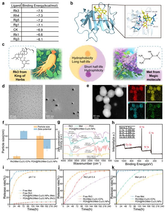 Preparation and characterization of PDA@Rk3/Met-Cu(II) NPs. (a) Molecular docking binding energy results of CXCL4 saponin-based targeted regulators. (b) Visualization results of the molecular docking between Rk3 and CXCL4. (c) Synergistic combination design of Rk3 and Met. (d) TEM images of Rk3/Met-Cu(II) ICPs and PDA@Rk3/Met-Cu(II) NPs. (e) EDS elemental mapping of C, N, O, and Cu. (f) Particle sizes and Zeta potential of Rk3/Met-Cu(II) ICPs and PDA@Rk3/Met-Cu(II) NPs by DLS. (g) FT-IR spectrum of PDA@Rk3/Met-Cu(II) NPs. (h) XPS spectrum of PDA@Rk3/Met-Cu(II) NPs. (i) Cumulative release of Rk3 and Met at pH = 7.4. (j) Cumulative release of Rk3 at pH = 5.4. (k) Cumulative release of Met at pH = 5.4.