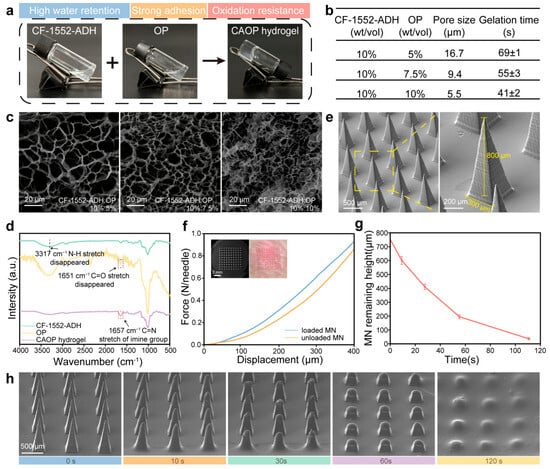 To synthesize a hydrogel MN backing with enhanced water retention, strong adhesion, and antioxidant properties, ADH was grafted onto CF-1552 to provide sufficient cross-linking sites for CF-1552 molecules. FT-IR analysis results showed that in the spectrum of CF-1552-ADH, the characteristic absorption peaks of both CF-1552 and ADH could be identified. The absorption peak at 1629 cm−1 in CF-1552-ADH was attributed to the C=O stretch of the amide in CF-1552, the peak at 1010 cm−1 to the C=N stretch of aliphatic amines in CF-1552, the peak at 2925 cm−1 to the C-H stretch of methylene in ADH, and the peak at 3317 cm−1 to the N-H stretch of the amide in ADH. These spectral features indicated the successful synthesis of CF-1552-ADH. To form enough acylhydrazone bonds, pullulan was oxidized by NaIO4. The stretching vibration peak of C=O in the aldehyde group appeared at 1651 cm−1. The emergence of this new characteristic absorption peak confirmed the successful oxidation of pullulan. Meanwhile, pullulan and OP exhibited similar characteristic absorption peaks, suggesting that the original structure of pullulan remained intact and its biological efficacy was unaffected (Figure S2). As shown in Figure 2a, by directly mixing the CF-1552-ADH solution and the OP solution, a CAOP hydrogel could be formed within 1 min. To ensure the effective biological activity of human-like collagen, the total concentration of CF-1552-ADH was fixed at 10% w/v. CAOP hydrogels with different OP concentrations were prepared (Figure 2b). After lyophilization, all hydrogels exhibited an irregular porous network structure (Figure 2c). As the OP concentration was increased, the pore size was decreased and the gelation time was shortened (Figure S3). FT-IR analysis results showed that CAOP hydrogel inherited the characteristic absorption peaks of the CF-1552-ADH and OP skeleton molecules, indicating that the CAOP hydrogel was composed of CF-1552-ADH and OP. Furthermore, the stretching vibration peak of N-H of primary amines in the infrared absorption spectrum of CF-1552-ADH and the stretching vibration peak of C=O in the infrared absorption spectrum of OP disappeared. At the same time, a new stretching vibration peak of C=N appeared at 1657 cm−1 in the infrared absorption spectrum of the CAOP hydrogel. These results demonstrated the successful formation of acylhydrazone bonds between CF-1552-ADH and OP (Figure 2d). In conclusion, the CAOP hydrogel was successfully synthesized.