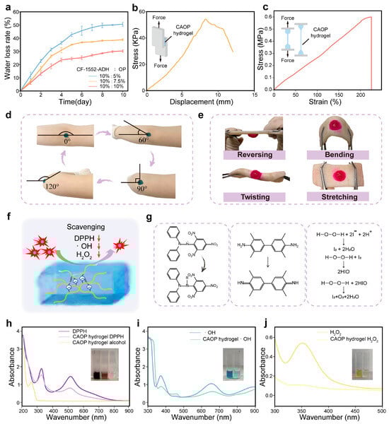 Characterization of CAOP hydrogel backing. (a) Water loss rate of CAOP hydrogels with different ratio. (b) Displacement–force curve in the lap shear test of the CAOP hydrogel and the schematic diagram of the lap shear test (inset). (c) Stress–strain curve of the CAOP hydrogel during stretching. (d) Adhesive performance of the CAOP hydrogel on the human elbow during movement. (e) The macroscopic mechanical stability of the CAOP hydrogel adhered to porcine skin tissue. (f) Antioxidant schematic diagram. (g) Mechanism diagram for detecting antioxidant ability. (h) Absorbance curves of the CAOP hydrogel before and after the reduction of DPPH. (i) Absorbance curves of the TMB color-development method before and after the scavenging of ·OH by the CAOP hydrogel. (j) Absorbance curves of the I2 color-development before and after the scavenging of H2O2 by the CAOP hydrogel.