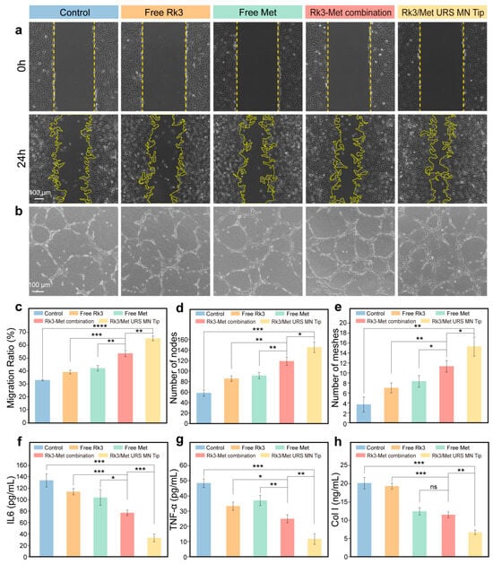 In vitro pro-angiogenic efficacy of Rk3/Met URS MNs. (a) Images of HUVECs migration under different treatments. (b) Images of tube formation of HUVECs on Matrigel after different treatments. (c) Quantitative analysis of cell migration rate. (d) Results of the number of nodes in each group. (e) Results of the number of meshes in each group. (f) ELISA results of IL-6 in HSFs under different treatments. (g) ELISA results of TNF-α in HSFs under different treatments. (h) ELISA results of Col I in HSFs under different treatments. * p < 0.05, ** p < 0.01, *** p < 0.001, **** p < 0.0001.