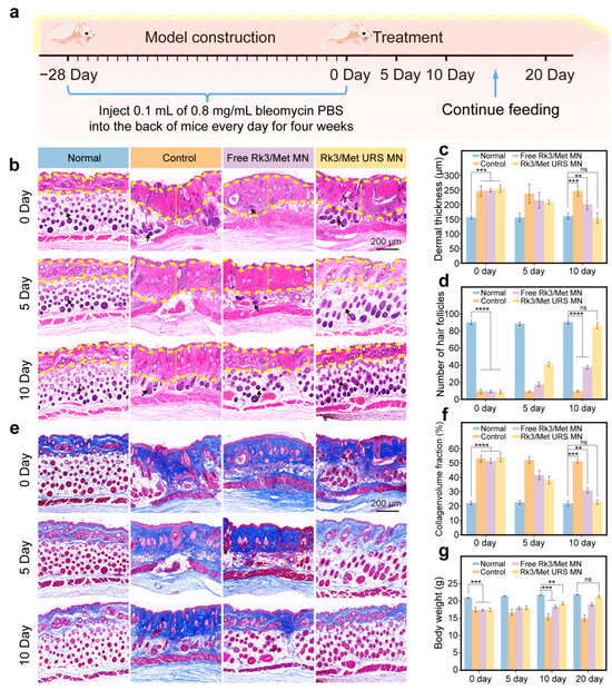 Forty female BALB/c mice were randomly allocated into four groups. In the first three groups, a daily injection of 0.1 mL of 0.8 mg/mL bleomycin phosphate-buffered saline (Xiaoyou Biotechnology, Hangzhou, China) was administered into the dorsal region of the mice for four consecutive weeks to induce SSc mouse models. The fourth group was injected with PBS on a daily basis. Subsequently, on the 29th day, three mice were randomly selected from each group for euthanasia to observe the modeling process. The four groups were designated as follows: the normal group consisting of unmodeled mice, the control group containing modeled mice treated with PBS, the free Rk3/Met MN group composed of modeled mice treated with free Rk3 and Met MN, and the Rk3/Met URS MN group of modeled mice treated with Rk3/Met URS MN. The MNs were inserted into the dorsal skin of the mice, and 200 µL of water was sprayed onto the MN backing to restore their hydrogel properties. The MNs were then fixed for a 10-day treatment. All experimental protocols were approved by the Animal Ethics Committee of Northwest University (Protocol Number: NWU-AWC-20240722M, approval date: 11 July 2024).