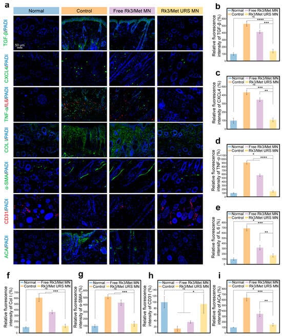 Further evaluation was conducted on inflammation, skin fibrosis, immunity, and angiogenesis regulated by CXCL4 and TGF-β to explore the process and biological mechanisms of lesion repair. The high expression of TNF-α and IL-6 in SSc skin fibroblasts is the root cause of the high-grade inflammatory response in SSc. Double immunofluorescence staining for TNF-α and IL-6 was performed on the lesional tissue on day 10 to assess the inflammation intensity at the lesion site [20]. As shown in Figure 6d,e, compared with the control group and the free Rk3/Met MN group, the expression levels of TNF-α and IL-6 in the Rk3/Met URS MN group were significantly reduced, indicating the remarkable anti-inflammatory activity of Rk3/Met URS MNs in the SSc model. Immunofluorescence staining of COL I and α-SMA showed a decrease in collagen expression and a reduction in α-SMA expression in the collagen layer, respectively. There was no significant difference in the levels of COL I and α-SMA on day 10 between the Rk3/Met URS MN group and the normal group, suggesting that Rk3/Met URS MNs could significantly inhibit the fibrotic effect of SSc, and the abnormal collagen deposition in the skin tissue after MNs treatment was maximally alleviated (Figure 6f,g). CD31 is a marker for neo-vascular endothelium. No CD31 fluorescence signal was observed in the SSc skin tissue of the control group, while the CD31 fluorescence signal was significantly increased in the Rk3/Met URS MN group (Figure 6h). High expression of the immune marker ACA can reflect the abnormal immune status of the SSc body [20]. ACA immunofluorescence staining showed a significant decrease in ACA expression levels in the Rk3/Met URS MN group compared with the control group on the 10th day after treatment (Figure 6i), indicating that the abnormal immune response in SSc skin lesions was effectively regulated during this treatment period. The above results indicated that Rk3/Met URS MNs had an ideal therapeutic efficacy on the four key issues of early-stage SSc immune dysregulation, inflammation, vascular abnormality, and aberrant fibrosis under the regulation of the dual key factors CXCL4/TGF-β.