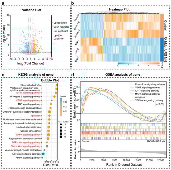 Bioinformatics analysis of RNA-seq for control and Rk3/Met URS MN groups. (a) Volcano plot comparing differentially expressed genes. (b) Heatmap showing the differential gene expression. (c) Bubble plot of KEGG pathway analysis. (d) Results of GSEA.