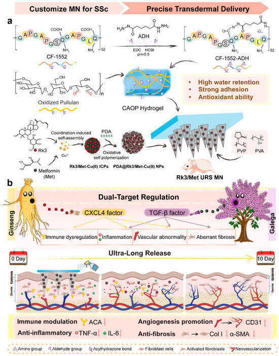 In this study, a customized ultra-long-release hydrogel microneedle system (Rk3/Met URS MN) was developed for SSc to achieve CXCL4/TGF-β dual-target regulation. The hydrogel backing was formed by dynamically crosslinking ADH-grafted recombinant collagen CF-1552 with oxidized pullulan via imine bonds, exhibiting excellent skin adhesion and mechanical properties while providing localized moisture retention and free radical scavenging. The rapidly dissolving microneedle tips, composed of polyvinyl alcohol (PVA) and polyvinylpyrrolidone (PVP), were loaded with sustained-release polydopamine-coated Rk3/Met nanodrugs, which self-assembled through coordination-induced interactions (Scheme 1a). These microneedles enabled synchronized transdermal delivery of hydrophobic Rk3 and hydrophilic Met, achieving ultra-long drug release with a single administration. Its application in vitro and standardized SSc mouse models demonstrated good biocompatibility, prolonged drug release, and CXCL4/TGF-β dual-targeted immunomodulation, along with anti-inflammatory, pro-angiogenic, and antifibrotic effects. The Rk3/Met URS MN provided an efficient, long-acting, and spatiotemporally synchronized transdermal delivery strategy for Rk3/Met, offering a promising approach for next-generation hydrogel microneedles in targeted SSc therapy (Scheme 1b).