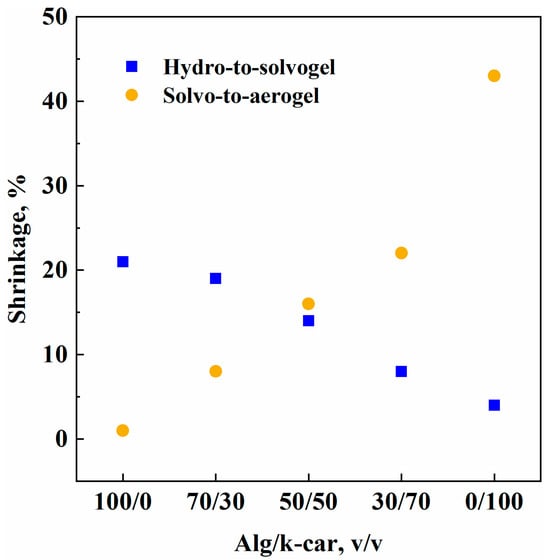 Evidently, alginate and k-carrageenan suffer shrinkage in different steps of the process. On the one hand, alginate is much more liable to solvent exchange than k-carrageenan: namely, shrinkage values plummet from about 20% to 4%. On the other hand, the response is inverted for the solvo-to-aerogel transition. For k-carrageenan, it is possible that the water–polymer interaction forces are as strong as ethanol–polymer interactions: however, when ethanol is extracted, chain–chain attraction forces are augmented, and this brings about structural compaction, thus shrinkage. Alginate, instead, is more sensitive to solvent exchange: a 20% shrinkage is observed, probably due to a slight network reconfiguration during liquid substitution. Nevertheless, once the structure is stable, it does not suffer solvent extraction: a negligible shrinkage value of 1% is obtained after supercritical drying. Shrinkage values for both steps follow an almost linear trend with k-car concentration: namely, it decreases for solvent exchange, and it increases for supercritical drying. Hybrid gels behave intermediately between alginate and k-carrageenan, and shrinkages’ linearity represents an equal contribution of the two chosen biopolymers to processing steps.