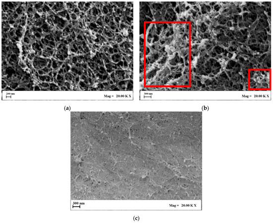 Landscape images of the produced porous structures confirm the general trend proposed in the scientific literature. Namely, oven drying yields nonporous devices (Figure 2a), whereas freeze drying generates voids of approximately hundreds of microns (Figure 2b), organized in the usual “crumpled paper” morphology typical of cryogels. On the other hand, aerogels display remarkable “roughness”, and smaller pores are kept intact during supercritical drying (Figure 2c). Morphological analysis is consistent with gel shrinkage considerations. Xerogels have virtually no pores, and every available void present in the native gel is sacrificed for compaction, thus volume reduction. Cryogels, instead, offer macropores that correspond to the ice templates sublimated during the drying step. Indeed, a larger void fraction exists, reflecting smaller shrinkage values. Aerogels show no damage to the original nanostructure, meaning that the liquid embedded in the gel has simply been swapped with air. Consequently, aerogels are the samples that display the lowest shrinkage value. In addition, there is no possibility to differentiate the morphological contribution of alginate from that of k-carrageenan by looking at the FESEM micrographs of xerogels and cryogels. Network compaction led to conglomeration, causing the two biopolymers to lose their attributes. In the case of aerogels, instead, it is possible to evidence the fishnet-like structure of alginate [37], as well as denser zones typical of k-carrageenan [38], meaning that these species are well blended and interconnected, possibly resulting in maintaining—yet, discerning—both the alginate’s elasticity and k-carrageenan hydrophilicity. Indeed, the effectiveness of supercritical drying in preserving the nanoscale interpenetrated network has been proved for other biopolymeric blends [37,39], but not for species that respond so conversely to contact with scCO2. To dive deeper into the morphological contributions of each biopolymer to the interpenetrated network, FESEM nanoscale observations of the produced aerogels are shown in Figure 3. For the sake of clarity, alginate, k-carrageenan, and the 50/50 mixture of them are reported, establishing that the relative abundance of the carrageenan’s and alginate’s zones is directly proportional with their ratio in the initial blend.