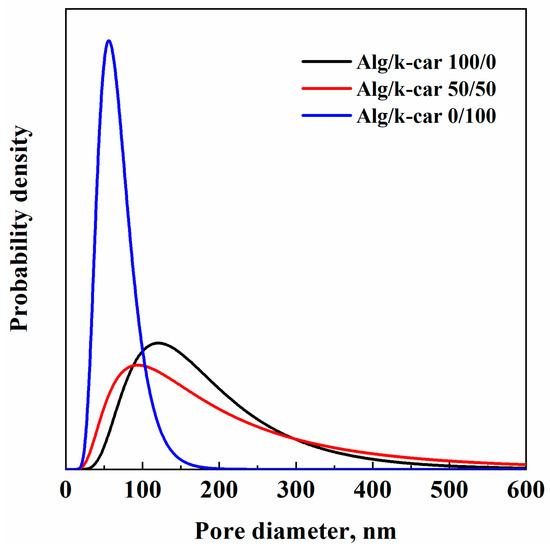 PSD is affected by the alginate/k-carrageenan ratio. The pore mean diameter values are about 121 nm, 94 nm, and 56 nm, respectively, with increasing k-carrageenan relative concentration. All the samples show, on average, nanosized pores. However, pure alginate and the 50/50 mixture exhibit pronounced skewness, due to the existence of a supramolecular hierarchical structure. Moreover, network densification due to k-carrageenan addition is evident by mean pore diameter reduction, and the widening of the distribution with respect to pure alginates. This behavior lies in the fact that there are denser zones—featuring, on average, smaller inner pores—resulting in other polymer-lean regions. Potentially, this shift of mean pore size and curve widening could result in an initial faster water intrusion—due to the “polymer-lean” regions, but also in a pronunciation of water uptake capacity due to k-carrageenan smaller pores. On the other hand, for pure k-carrageenan aerogels, there are fewer, yet smaller pores due to the absence of a structured network like alginate’s; but distribution is narrower. Overall, PSD evaluation is useful for drug delivery purposes: by engineering the pores’ width, and thus aerogel composition, release can be tailored.