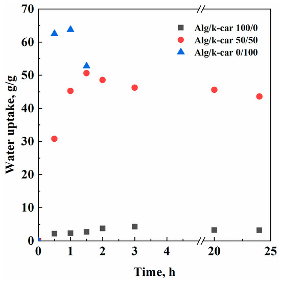Aerogels’ water uptake capacity can be considered as the result of different counteracting mechanisms. The network swells due to absorption, up to the moment in which polymer–water interactions or the mechanical stress exerted by the fluid’s surface tension outweigh chains’ elasticity. In that moment, aerogels are eroded, losing part of their initial weight. Otherwise, if the structure is not disrupted, a plateau value can be expected. As shown in Figure 5, in the case of alginate aerogels, there is a limited mass loss, probably due to unreacted chains that are redissolved in water during imbibition. However, the interconnected network is more stable than elastic, resulting in a system that hosts small amounts of water (i.e., a maximum of 4.3 g/g), but is resistant over time. On the other hand, k-carrageenan is surprisingly hydrophilic: it can absorb water up to 63.77 g/g. Nevertheless, the combination of carrageenan aerogels’ small pore size and their high hydrophilicity results in their dissolution in short times: a significant mass loss was measured after 1 h. The Alg/k-car 50/50 mixture, instead, is as stable as alginate, but its water absorption capacity takes after the carrageenan fraction. In terms of water uptake and resilience, the hybrid produced outperforms some other k-carrageenan aerogel beads proposed in the scientific literature, whose maximum water uptake capacity is about half of the one obtained in this work [40]. Overall, it is possible to combine the most useful features of k-carrageenan and alginate to engineer a porous device intended for drug delivery applications. Having a full prospect of aerogel composition, pore size, and water uptake capacity, it is possible to tailor the rate of drug release in the intestinal tract.