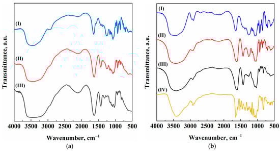 FT-IR spectra of (I) Alg/k-car 0/100, (II) Alg/k-car 50/50, (III) Alg/k-car 100/0, (IV) Naringin: (a) Blank aerogels; (b) Loaded aerogels.