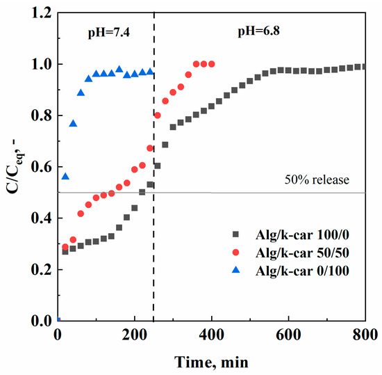 Once the characterizations of interest were carried out, naringin release profiles were obtained. Specifically, the Alg/k-car 100/0, 50/50, and 0/100 aerogels were immersed in PBS at sequentially different pH values (i.e., 7.4 and 6.8), to simulate naringin release in the intestinal and colonic tract. The experimental points obtained are reported in Figure 7.