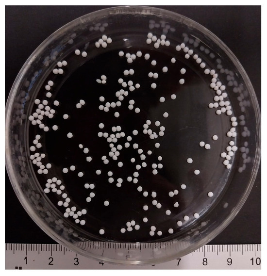 Hydrogel beads were prepared by solution dripping and ionotropic gelation. For both alginate and k-carrageenan solutions, a concentration of 2% w/v was chosen after preliminary trials. Sodium alginate and k-carrageenan 2% w/v aqueous solutions were prepared separately at room temperature, gently stirred to avoid air bubbles’ entrapment in the polymeric solution. To obtain the 50/50 Alg/k-car blend, the two solutions were mixed by a 1:1 volumetric ratio. Once the desired solutions were prepared, they were extruded using a syringe pump (KF Technology, mod. AL-1000, Roma, Italy) through a 27G needle, so that beads could be small enough with a view to oral drug delivery. Flow rate was set at 0.25 mL/min, to achieve correct solution dripping without incurring in filament generation (higher flow rates)—also taking into account solutions’ viscosity and resistance to flow. Solution droplets were set to fall into aqueous coagulation baths, whose composition was CaCl2 2 M for alginate spheres, KCl 2 M for k-carrageenan beads, or equimolar mixtures of them for the hybrid solutions. After extrusion, the beads were aged in the coagulation bath for 2 h to ensure complete gelation; then, they were rinsed with distilled water to remove unreacted salts. For xerogels and cryogels production, no further post-processing was applied. Xerogels were obtained by locating hydrogels into an oven, kept at 40 °C and at 0.5 bar overnight. For cryogels production, a cryostat (LyoQuest-55 Plus ECO, Seneco srl, Milan, Italy) was employed, set at −50 °C and under vacuum for 12 h. To obtain aerogels, hydrogels were converted to solvogels by gradual solvent exchange with ethanol. Ethanol/water solutions were employed, at gradually increasing ethanol concentration (i.e., 10, 30, 50, 70, 90, 100% v/v). Each step was set to last for 1 h, exception made for the pure ethanol exchange that lasted overnight. Then, supercritical drying was performed at 200 bar and 35 °C, for 1.5 h plus a slow depressurization step. This process was carried out in a lab-scale supercritical drying unit, whose details are already reported elsewhere [24]. For clarity purposes, a digital image of Alg/k-car 50/50 aerogels is reported in Figure 8.