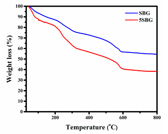 In order to select suitable calcination temperatures, 0SBG and 5SBG as-prepared sol-gelled powders were examined using thermogravimetric analysis, and the results are shown in Figure 1. Generally, the sol-gelled powders exhibited various stages of weight loss before stabilization. For the 0SBG powder (blue curve in Figure 1), a weight loss (6.4%) before heating up to 100 °C was observed. This can be attributed to the vaporization of absorbed water within the powder. Within the temperatures ranging from 100 to 325 °C, another weight loss (18.2%) occurred, probably due to the decomposition of organic solvents. From 325 to 600 °C, organic solvents continued to decompose, and crystallization occurred, which resulted in another stage of weight loss, 18.7%. Thereafter, limited weight loss of ~2% was exhibited for temperatures ranging from 600 to 800 °C. The overall weight loss for 0SBG powder was 45.3% during thermogravimetric analysis from room temperature to 800 °C. A similar trend can be observed for 5SBG powder (red curve in Figure 1), but the magnitude of weight loss (61.7%) was larger when compared to that of 0SBG powder. The weight loss for various stages was 12.2% (RT to 100 °C), 27.2% (100–325 °C), 19.5% (325–600 °C), and 2.3% (600–800 °C), respectively. The increase in weight loss with the substitution of calcium by strontium was also reported in the literature [21,25].