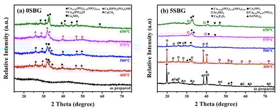 With the addition of strontium (Figure 2b), the as-prepared sol-gelled 5SBG powder exhibited a mixture of Ca0.33Sr0.67(NO3)2 phases (PDF 26-1073) and Sr(NO3)2 (PDF 25-0746). After calcining at 400 °C, Sr(NO3)2 disappeared, the crystalline peaks of Ca0.33Sr0.67(NO3)2 became more evident, and the formation of Ca2SiO4 was observed. When the calcination temperature was further increased to 500 °C, partial decomposition of the Ca0.33Sr0.67(NO3)2 phase (from 86.0 to 59.0 wt.%) was observed. In addition, a slight increase in the percentage of Ca2SiO4 (from 14.0 to 25.2%) and the formation of a calcium pyrophosphate (Ca2P2O7, PDF 33-0297) phase were observed [29]. The nitrides were decomposed completely after calcination at a temperature of 575 °C, and the formation of Ca14.92(PO4)2.35(SiO4)5.65 (PDF 83-1494) occurred [30]. For 650 °C-calcined 5SBG powder, Ca14.92(PO4)2.35(SiO4)5.65 was the major phase (87.8%), with a minor Sr2SiO4 (PDF 38-0271) phase [31]. The XRD patterns with detailed diffraction peaks of those referred phases are shown in Figure S1. The relative percentages of various phases for calcined-5SBG powders are summarized in Table 2.