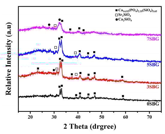For testing the practical usage of bioactive glass, a calcination temperature of at least 650 °C was used in a previous study [21]. Thus, the calcination was set at 650 °C to investigate the effect of strontium concentration. Figure 3 shows 0–7SBG powder after calcination at 650 °C for 3 h. It can be noted that calcium phosphate silicate (i.e., Ca14.92(PO4)2.35(SiO4)5.65) was the major phase for all 0–7SBG powders, and its percentage decreased with increasing Sr concentration. With the addition of strontium, the formation of Sr2SiO4 was observed. Figure S2 shows the XRD patterns of 650 °C-calcined 0–7SBG powder with the referred phases. The amount of strontium silicate increased with increasing Sr addition up to 5SBG. For 7SBG with a high Sr concentration, the formation of calcium silicate was observed. Table 3 summarizes the resulting phases and the corresponding percentage of these 0–7SBG powders.