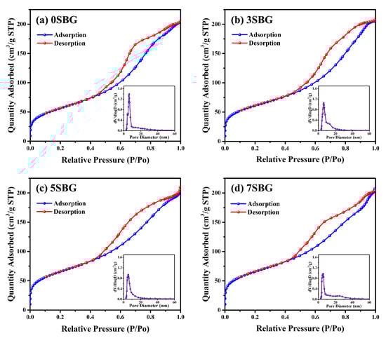 BET analysis of (a) 0SBG, (b) 3SBG, (c) 5SBG, and (d) 7SBG powder after calcination at 650 °C for 3 h. The insert in each figure shows the result of pore size analysis.
