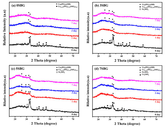 The bioactivities of the SBG powders were investigated by immersing them in simulated body fluid. The crystalline structure, powder morphology, and functional groups before and after immersion in simulated body fluids (SBFs) were examined using X-ray diffraction, scanning electron microscopy, and FT-IR spectroscopy. Figure 5 shows the XRD patterns of 0–7SBG powders before and after immersion in SBF for 1, 3, and 7 days, respectively. Similar behavior was observed for all SBG powders. After immersion in SBF for 1 day, almost all the crystalline peaks of the SBG powders disappeared (Figure 5a,b) or weakened significantly (Figure 5c,d). This suggests that the calcium or strontium (phosphate) silicates were dissolved into the SBF solution after immersion in SBF. For 0SBG powder with prolonged immersion to 3 or 7 days (Figure 5a), ambiguous hydroxyapatite crystalline peaks (PDF 09-0432) were observed after 7 days of SBF immersion [34]. With the addition of strontium (3SBG, Figure 5b), the formation of hydroxyapatite was observed after 1 day of SBF immersion, and the peak intensities increased with immersion time. This phenomenon became more evident for 5SBG, Figure 5c. The crystalline peaks of HA were the strongest compared to the other SBG powders. The HA phase became uncertain when the Sr concentration further increased to 7%, Figure 5d. The superfluous Sr concentration did not further improve the in vitro bioactivity but hindered the formation of hydroxyapatite. This shows a similar trend to that reported in the literature [4,23]. The crystalline phases of XRD patterns with references before and after immersion in SBF were presented in Figure S3. The SBF immersion experiments suggest that 5SBG powder exhibited optimal in vitro mineralization activity.