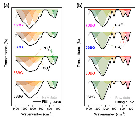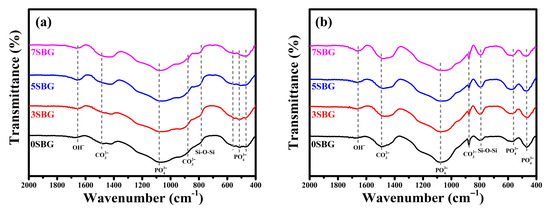 Figure 6 shows the FT-IR spectra of 0–7SBG powders before and after immersion in SBF for 7 days. As shown in Figure 6a, similar FT-IR spectra were observed for all SBG powders. Relatively broad bands of PO43− at 1073, 559, 517, and 469 cm−1 were observed together with CO32− (1490 and 878 cm−1), Si-O-Si (783 cm−1), and OH- (1654 cm−1) bands. After SBF immersion (Figure 6b), these bands became more evident compared to those of the so-prepared SBG powders. The vibration bands of PO43− at 1076, 563, and 468 cm−1 indicated the formation of hydroxyapatite [35,36].