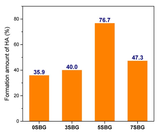 The presented FTIR curves were further deconvoluted with the observed bands with the Gaussian method [37,38,39]. The main difference of absorbed bands for HA formation fell within the wavenumber range from 1400 cm−1 to 400 cm−1. The PO43− functional groups (1073, 559, 517, and 469 cm−1), which were the characteristic IR absorption bands of HA, were calculated from their obtained fitting area percentage for semi-quantifying HA formation in SBF. Figure 7a shows the IR deconvolution curves with their fitting area. The estimated amounts of PO43− functional groups were 58.6, 50.2, 43.7, and 44.8% for 0, 3, 5, and 7SBG, respectively. After 7 days of immersion in simulated body fluid, as shown in Figure 7b, the absorbed bands of PO43− grew to 77.2, 70.3, 77.2, and 66.0% for 0, 3, 5, and 7SBG, respectively. The existence of CO32− is able to enhance the HA formation [40,41]. However, the amount of CO32- (878 cm−1) decreased after 7 days in simulated body fluid immersion from the FTIR spectra. The results suggest that the OH− in simulated body fluid (pH = 7.4) reduced the amount of CO32− on the SBG powders [42]. The amounts of PO43− and CO32− are listed in Table 5. Furthermore, the HA formation amount was calculated by the difference of the PO43− amount before and after SBF immersion to compare the HA formation ability, and the results are shown in Figure 8. It can be noted that the doping of Sr in bioactive glass improved the HA forming ability, and 5SBG exhibited the highest formation amount of HA (76.5%).