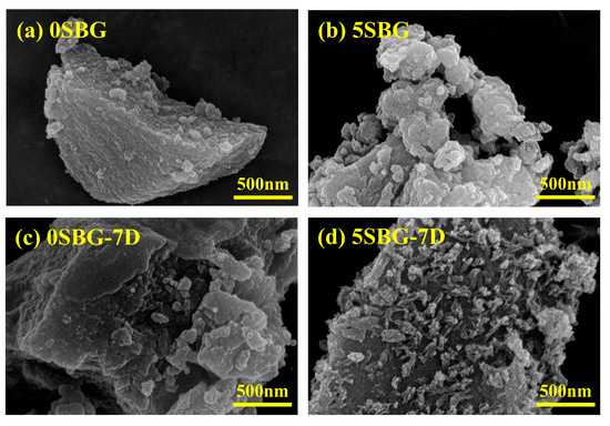 SEM images for 0SBG and 5SBG before (a,b) and after (c,d) immersion in simulated body fluid for 7 days, respectively.