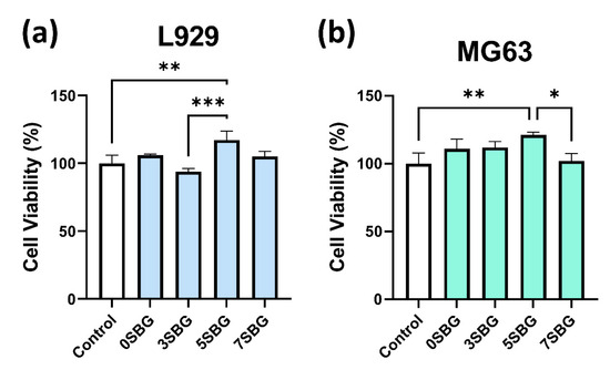 Cell viabilities of (a) L929 and (b) MG63 for SBG powders were examined by using CCK-8 assay. *, **, and *** indicate that these two samples were statistically different at a 95%, 99%, and 99.9% confidence intervals, respectively.