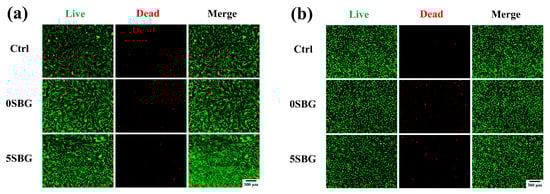 Live/dead staining assay of (a) L929 and (b) MG63 cell lines for 0SBG and 5SBG powders.