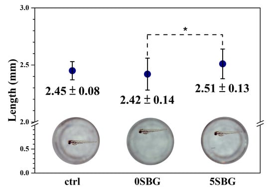An in vitro animal test was performed using a zebrafish model (n = 30) to evaluate the cytotoxicity of the SBG powder. The hatch rate of the control group was 86.67%, and 0SBG and 5SBG had similar hatch rates of 83.33% and 86.57%. After hatching, the mortality rate was 0% for all three examined groups. Figure 12 shows the average length of the zebrafish after 72 h post-fertilization (i.e., hpf) and the images of selected ones from each group. The average length was 2.45 ± 0.08 mm for the control group, which remained the same for 0SBG (2.42 ± 0.14 mm), and slightly increased to 2.51 ± 0.13 mm for 5SBG. Only 0SBG and 5SBG were significantly different, with a p-value of 0.0294. This suggests that, in the zebrafish animal model, 5SBG did not exhibit cytotoxicity and was beneficial for the growth of zebrafish [46]. Bioactive glasses are known to release biologically active ions, such as calcium, silicon, and phosphorus, to promote skeletal development. The observed increase in body length may be attributed to the stimulatory effects of BG-derived ions on bone tissue formation and cellular proliferation [46]. Moreover, strontium is known to stimulate osteoblast activity to accelerate bone differentiation and mineralization during early development. The synergistic effect of Sr ions, alongside the release of Ca and Si from the BG matrix, [47] implies there is an osteoinductive potential in Sr-added bioactive glass when applied to zebrafish models.