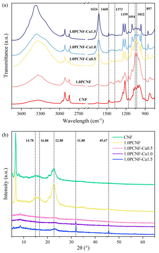 (a) FTIR spectra of CNF, 1.0PCNF, 1.0PCNF-Ca0.5, 1.0PCNF-Ca1.0, and 1.0PCNF-Ca1.5. (b) XRD curves of CNF, 1.0PCNF, 1.0PCNF-Ca0.5, 1.0PCNF-Ca1.0, and 1.0PCNF-Ca1.5.